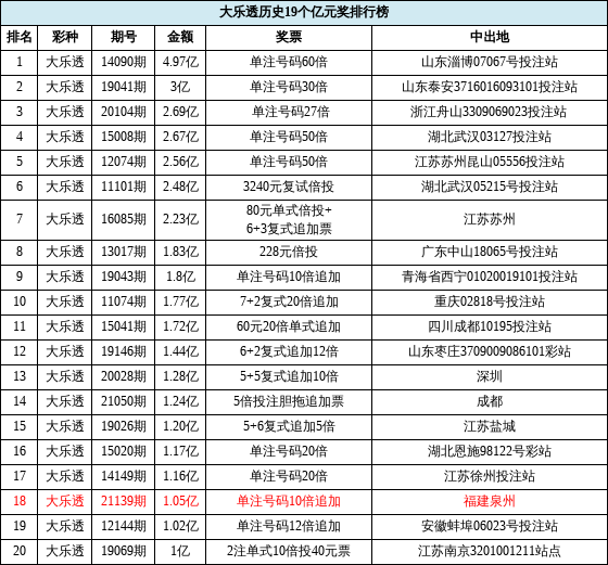 此次开出的1.05亿大奖,是大乐透时隔213天后再次开出亿元奖。截止目前,体彩大乐透一共开出20个亿元奖,本次的1.05亿排名大乐透亿元奖第18位!