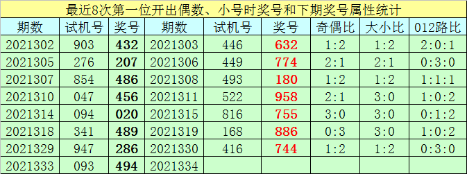 前7次第一位号码开出偶数、小号时奖号分别为:432、207、486、456、020、489、286,其中奇偶总比例为4:17,有4期奇偶比与上期奇偶比相同;号码大小总比例为9:12,有1期奖号大小比与上期大小比相同;