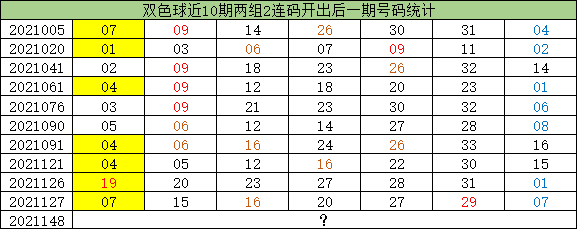 要说起同一期开出两组二连码这个形态,对于双色球来讲绝对不算是什么太过罕见的形态,单单就2021年就开出过11次,也正是这样的开出频率,更加方便了我们在其中寻找规律。笔者将近10次两组二连码形态开出的后一期号码进行了统计,竟在其中发现了一些有意思的规律: