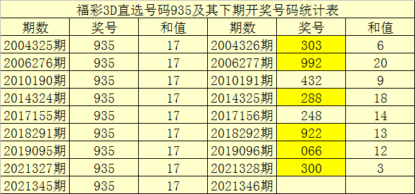 一、开奖回顾:第2021345期福彩3D奖号为935。奖号奇偶比为3:0,和值为:17,跨度为:6。