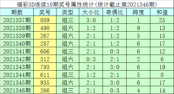 开奖回顾:福彩3D第2021346期奖号为266。奖号形态为组三,大小形态为小大大,奇偶形态为偶偶偶,和值为14,跨度为4。