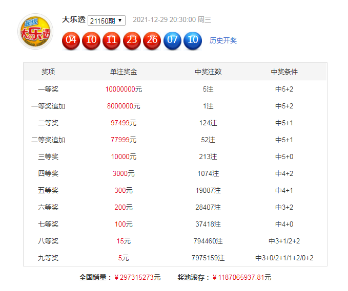 上期开奖:大乐透第2021150期开奖号码为:04 10 11 23 26 +07、10,各位号码遗漏值分别为:1 25 7 10 0 + 2 0。