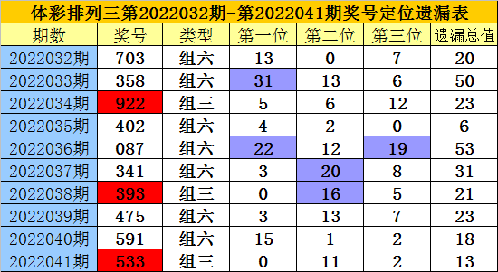 开奖回顾:排列三第2022041期奖号为:533,各位号码遗漏值分别为0、11、2,遗漏总值为13。