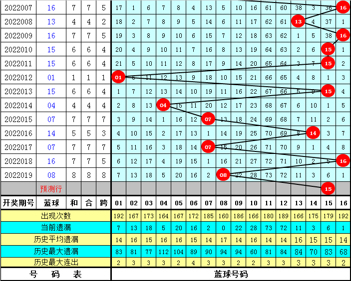 蓝球:上期蓝球号码为08,开出小号、偶数,蓝球最近7期大小比为3:4,本期注意大号蓝球出现,蓝球关注15。