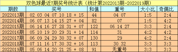红球重号:上期没有开出重号红球,在连续7期开奖中,重号出现6期,在最近3期中奖,重号出现2期,本期预计重号热出,关注2个,参考号码05、14。