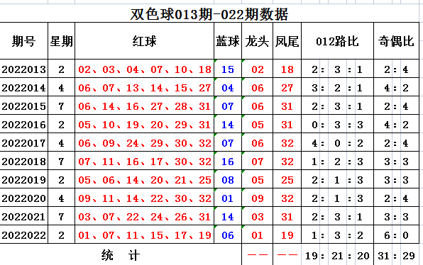 上期回顾,双色球22022期开出奖号:红球01 07 11 15 17 19,蓝球06。当期红球号码大小比为2:4,三区比为3:3:0,奇偶比为6:0。本期红球开出重号07,未开出连号。蓝球开出小偶数球06。