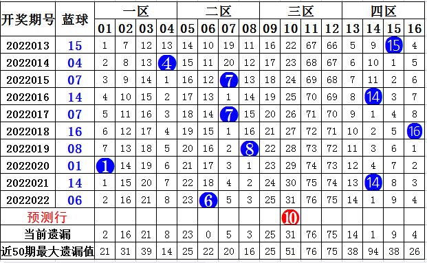 上期开出偶数号码06,近10期蓝球奇偶比为5:5,奇、偶数号码走势较均,本期看好偶数开出。蓝球重点关注:01 03 10 13 15,本期推荐:10