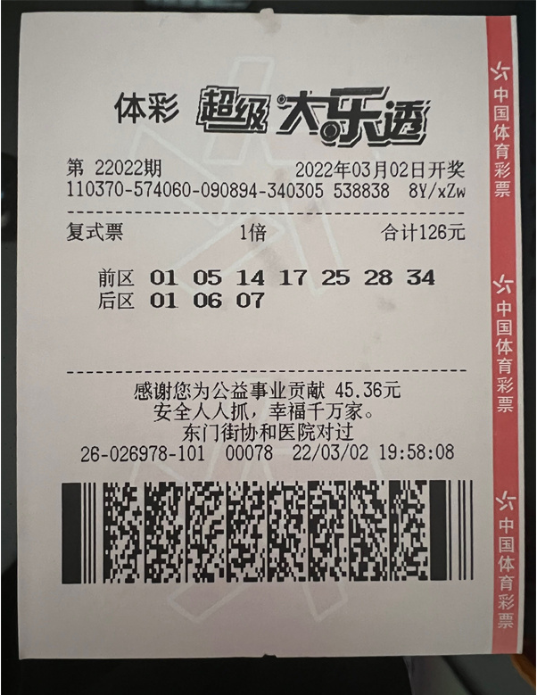 3月2日,体彩大乐透第22022期前区开出号码“01 05 14 17 28”,后区开出号码 “06 07”。本期全国共开出4注一等奖,其中一注花落菏泽。