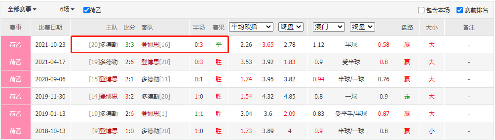 交战记录: 双方近6次交战,登博思5胜1平0负,进21球,失10球,大球5次,小球1次 ,主队占优,但首回合客场被对手落后3球追平,如下图: