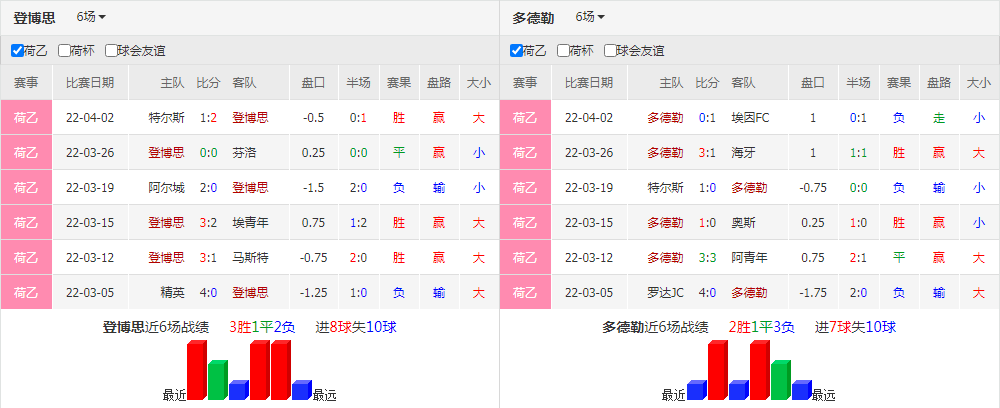 近况方面:相同赛事 登博思近6场战绩3胜1平2负进8球失10球 ,表现不错,攻防均衡;客队 多德勒近6场战绩2胜1平3负进7球失10球 ,表现稍差,如下图: