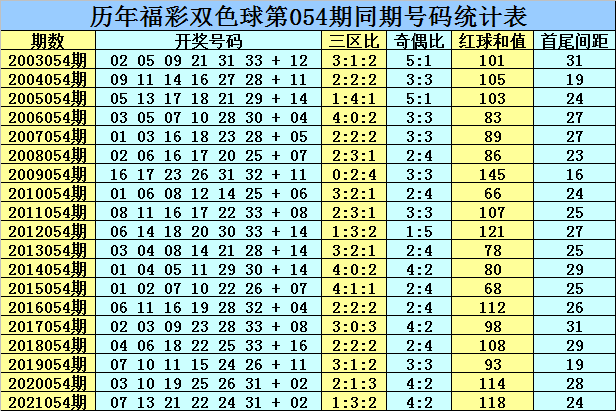 和值分析:在历年第054期开出中,红球和值出现范围在66-145区间,和值波动范围较大,其中大和值开出了9次,出现比例相对较低,去年同期开出大和值之后,今年同期预计大和值再次出现,看好出现范围在114-124区段。