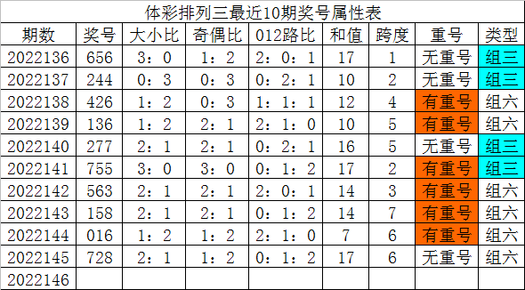 体彩排列三最近10期分别开出奖号:656、244、426、136、277、755、563、158、016、728,各奖号属性详见下表: