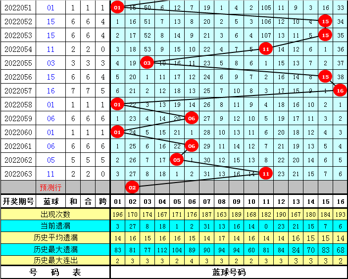 蓝球分析:最近100期蓝球号码开出频次分别为:01出现10次,08、15出现9次,04、09出现8次,05、06、07、14、16出现7次,02出现6次,10出现5次,13出现4次,03出现3次,11出现2次,12出现1次。