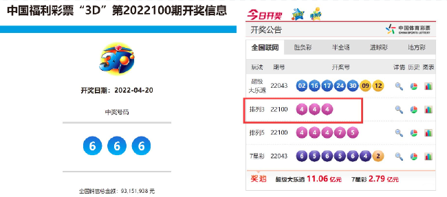 今年的4月20日,排列三与福彩3D同天开出豹子号!体彩排列三第22100期先是开出号码“4 4 4”,在随后的福彩3D第22100期开奖中又开出“6 6 6”,这种两玩法同天开豹子号的情况,还是历史首次!更早之前,福彩3D和体彩排列三还曾同天开出相同奖号,如2008年12月11日同开“4 5 2”、2014年11月15日同开“2 9 6”等。