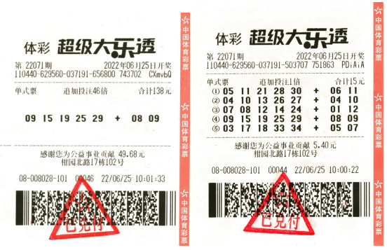 6月25日,超级大乐透第22071期开奖。广东省肇庆市端州区柑园北路17栋102号的4408008028体彩实体店共中出47注追加一等奖,总揽奖金4.48亿元。中奖彩票分两张,一张为46倍投的138元单式追加票,单票擒奖4.39亿元;另一张为5注15元投入的单式追加票,单票擒奖954万元。