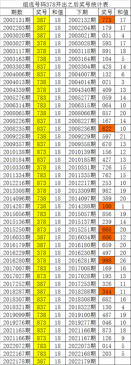 福彩3D第2022178期开出组选号码:378,该号码历史上组选出现了45次,其下期分别开出了号码:773、179、031、593、891、104、428、132、021、409、059、064、857、167、622、597、670、156、427、726、762、253、982、389、100、856、239、668、606、659、497、998、169、193、326、344、682、130、487、046、873、126、014、203,如图: