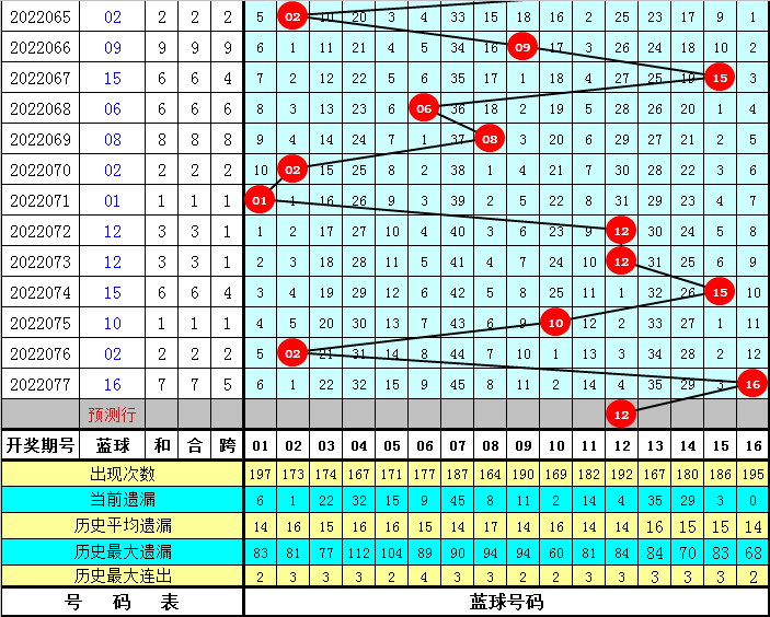 三、蓝球号码分析:上期蓝球奖号开出16,该号码在历史上出现了195次,其下期开出蓝球频次从高到底分别为:05→03→06→11→07→02→14→01→08→12→13→04→09→10→15→16,出现频次在18次-9次之间,本期四码蓝球关注05、11、12、13。
