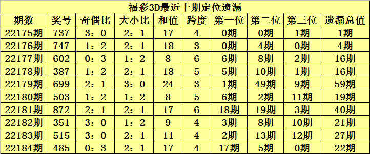 开奖回顾:福彩3D第2022184期奖号:485,百位号码遗漏17期、十位号码遗漏5期、个位号码遗漏0期,遗漏总值为22期。