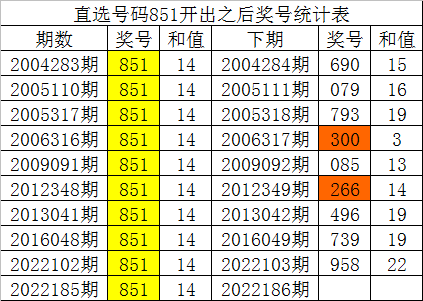福彩3D第2022185期开出直选号码为:851,该直选号码历史上出现了10次,其下期分别开出了号码:690、079、793、300、085、266、496、739、958,如图: