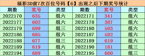 在百位号码6前7次开出之后,其下期分别开出号码:3、3、5、5、6、1、6,其中号码奇偶比为5:2,大小比为4:3,012路比为4:1:2。