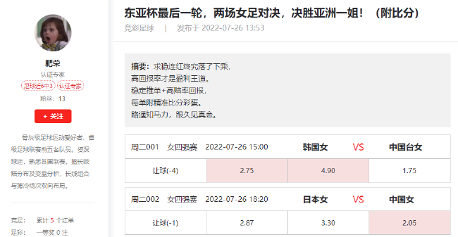 中国台北队排名亚洲第5,上轮面对实力强大的日本队率先进球,给球队增加不少信心,本次出战同样实力强大的韩国队,踢出比上轮比赛更好的表现,少输当赢是首要目标。结合近期战绩,让4球开盘还是比较深的,下盘必将受到热捧,本场推荐韩国队让胜平。