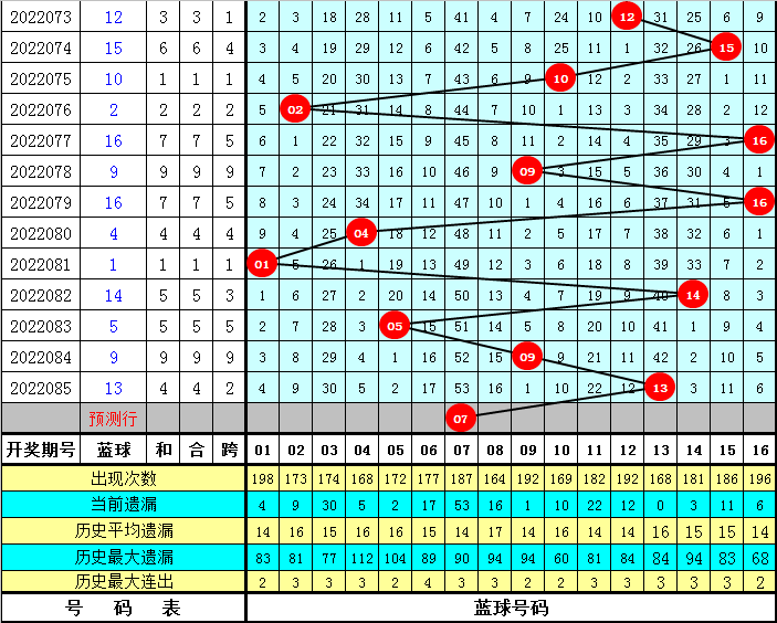 蓝球分析(热码:遗漏0-6期的蓝球,温码:遗漏7-14期的蓝球,冷码:遗漏14期以上的蓝球):上期遗漏42期的冷码蓝球13解冻,目前热码蓝球有7个:01、04、05、09、13、14、16,温码蓝球有4个:02、10、12、15,冷码蓝球有5个:03、06、07、08、11,本期精选冷码蓝球解冻,关注号码07。
