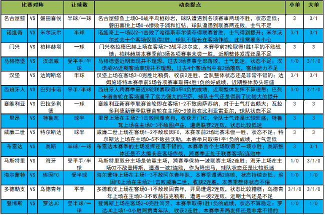 马格德堡近期表现并不理想,过去3场赛事全部落败,士气低迷,状态不足,此役主场面对近期客场表现并不理想,过去4个客场当中有2场落败,客场能力不足的汉诺威,机构给出受平半的让步居多,对于客队并没有十足的高看,此役建议大单全包;西班牙人跨赛季最近8轮联赛取得4平4负的成绩,近期整体发挥不算理想,此役主场面对首轮在客场逼平了实力强大的巴萨,球队士气还是得到了比较大的提升的巴列卡诺,机构给出让平半的让步居多,对于主队的阵容实力还是没有十足的信心,此役建议大单全包。