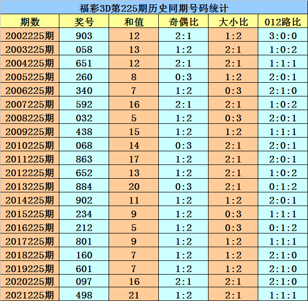 福彩3D第2022225期开奖日期:2022年8月23日,历史上第225期已开出了20次奖号,历年同期号码分别为:903、058、651、260、340、592、032、438、068、863、652、884、902、234、212、801、160、601、097、498。