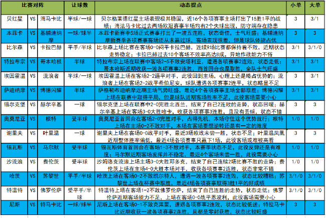 本期让步较多的比赛场次有2场。本菲卡新赛季5场正式赛事打出了一波五连胜,状态奇佳,士气旺盛,此役主场面对新赛季各项赛事客场还从未赢过球,客场表现很差,但是球队体能占优的基辅迪纳摩,机构给出让一球球半的让步,对于本菲卡还是有一定的高看,此役建议关注单3;尼斯上场在客场0-1不敌克莱蒙,遭遇各项赛事2连败,状态比较低迷,此役主场面对近期收获一波各项赛事2连胜,且都是零封获胜,状态比较旺盛的特马卡比,机构给出让一球球半的让步,而主队的指数或有下调的趋势,对于主队有利,此役建议关注单3。