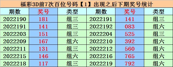 在百位号码1前7次开出之后,其下期分别开出号码:1、0、5、3、5、7、7,其中号码奇偶比为6:1,大小比为4:3,012路比为2:3:2。
