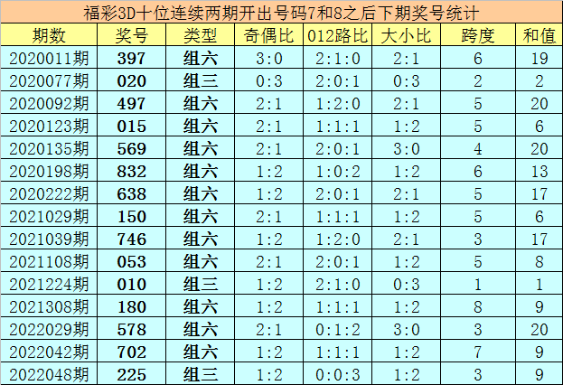 十位号码:前两期十位分别出现奖号7-8,历史上福彩3D连续前后分别开出号码7-8的现象共开出89次。在十位7-8的现象出现时,最近15期其下期分别开出号码:397-020-497-015-569-832-638-150-746-053-010-180-578-702-225;