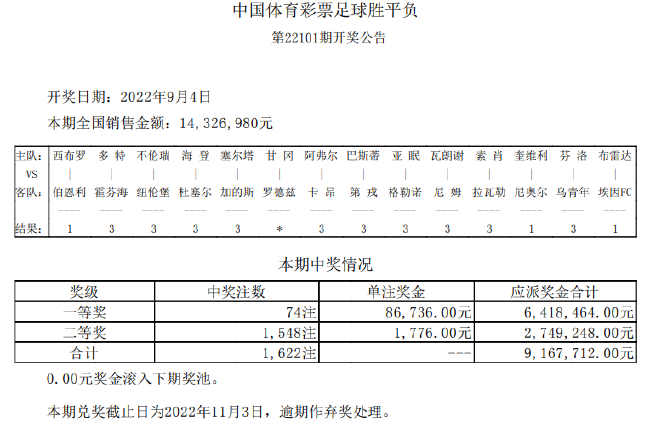 北京时间9月4日,胜负彩第22101期开奖结果揭晓。本期一等奖开出74注,单注奖金8.6万余元;二等奖开出1548注,单注奖金1776元;任选9场开22839注,单注540元。本期胜负彩销量为14,326,980元,任九投注总额为19,302,970元。