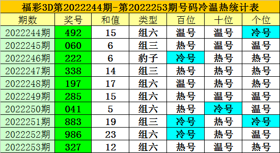上期回顾:福彩3D第2022253期开奖奖号为:327,奖号类型为:组六,奖号冷温热态为:热号+温号+热号。