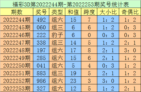 上期回顾:福利彩票3D第2022253期开出奖号327。奖号类型:组六,大小形态:小小大,奇偶形态:奇偶奇。
