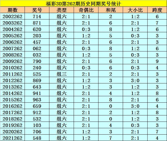 福彩3D历年第262期同期奖号为:714 871 620 203 457 062 032 790 240 525 869 643 941 963 659 912 532 103 706 548。