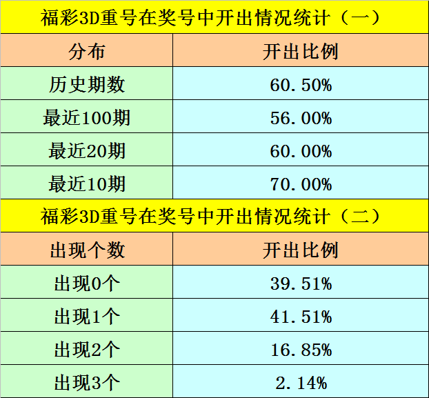 最近100期开奖中,含有重号的奖号有56期,最近20期含有重号的奖号有12期,最近10期含有重号的奖号有7期。本期注意重号落号。