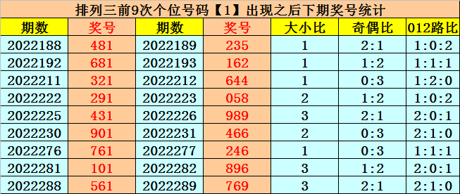 在十位前9次出现号码1后,其下期奖号分别开出:7-8-8-0-4-4-2-3-3,其中奖号个数奇偶比是3:6,大小比是3:6,012路比是3:3:3。