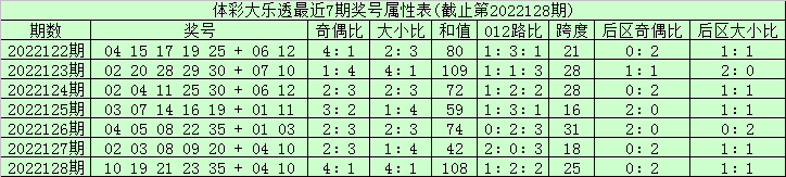 3、前区和值分析:上期前区和值开出108,与第2022127期和值相比上升了66点,本期看好和值转向下降,预计开出90-100之间和值。
