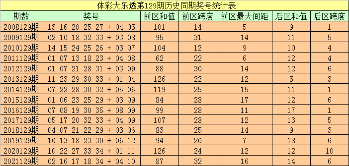 4、在第129期历史同期开奖中,前区号码和值全部在62-126之间开出,其中和值奇偶比为7:7,大小比为9:5,对比去年第129期前区和值,本期预计和值上升,看好出现在100-109之间。