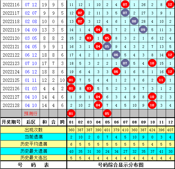 7、在第129期历史同期开奖中,后区奖号和值出现范围在5-18之间出现,其中和值奇偶比为7:7,大小比为3:11,012路比为7:2:5,本期看好后区和值为6。