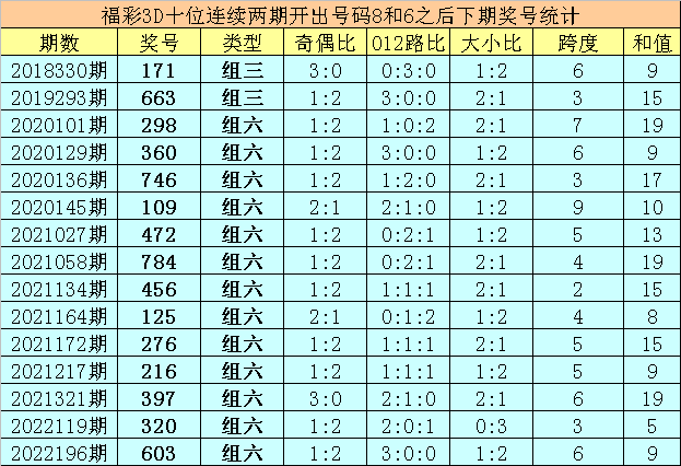 十位号码:前两期十位分别出现奖号8-6,历史上福彩3D连续前后分别开出号码8-6的现象共开出78次。在十位8-6的现象出现时,最近15期其下期分别开出号码:171-663-298-360-746-109-472-784-456-125-276-216-397-320-603;