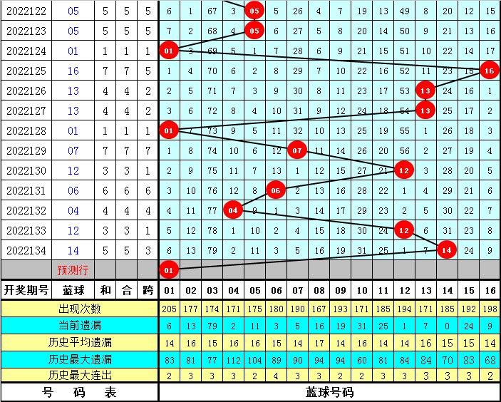 四、蓝球分析:在第135期历史同期开奖中,蓝球号码奇偶比为5:11,012路比为5:10:1,大小比为,11:5。