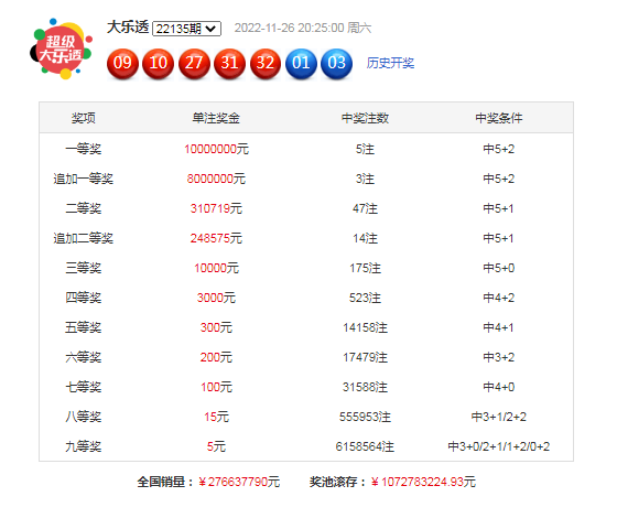大乐透第2022135期开奖号码为:09、10、27、31、32+01 03。其中前区奖号三区比为2:0:3,奇偶比为3:2,包含2个重号:27、32,后区为全一区号码。