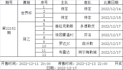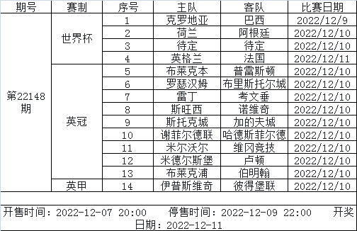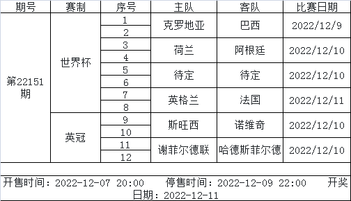 北京时间2022年12月6日,国家体彩中心公布了2022年12月9日-12月15日足彩赛程。未来一周14场和任九仅会开售1期竞猜,由世界杯、英冠、英甲3项赛事组成,停售时间为12月9日晚。另外,6场半全场游戏将开售2期,4场进球彩游戏开售2期。以下为详细通知: