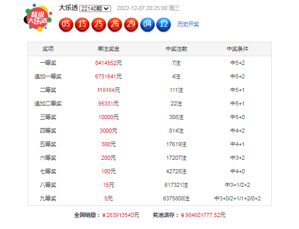 大乐透第22140期开奖。当期开奖号码为前区:05 15 25 26 29,后区04 12。当期前区号码大小比为3:2,奇偶比为4:1,三区比1:1:3;前区开出1组连号25 26,后区开出小大组合04 12。