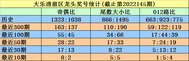 龙头号码奇偶比为8:2,尾数大小比为5:5,012路比为1:5:4。