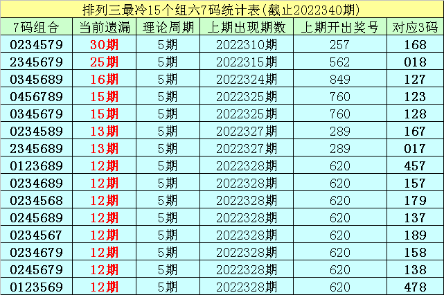 (1)在排列三已开出的6410期奖号中(统计截止第2022340期),目前7码组六遗漏值最大的组合为:0234579,本期遗漏30期;