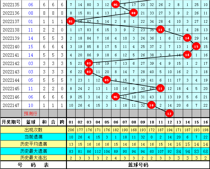 前九周星期日开出8个蓝球号码,蓝球以冷码为主,热码蓝球开出相对较少,还没有出现的蓝球为:04、05、06、07、09、10、15、16,共8个,本期注意热码蓝球出现,一码蓝球参考12。