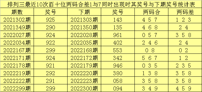 百十位合差分析:上期奖号百十位开出92组合,两码合为1,两码差为7,最近10次百十位两码合1与两码差7同时出现时,其奖号和下期奖号分别为: