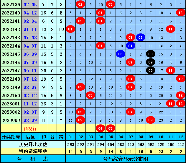 后区分析:最近30期后区奖号012路比为23:22:15,最近10期后区奖号012路比为9:6:5,上期后区为2路+0路组合02和09,本期后区参考号码01、03、04、05、07,看好开出1路号码和2路号码,两码关注04、05。